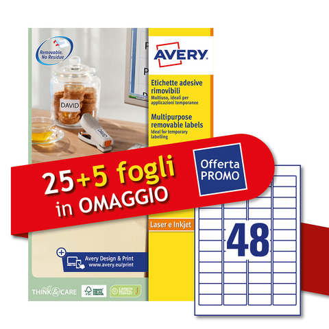Etichette bianche rimovibili Avery laser/inkjet 48 et./foglio conf.25+5 ff OMAGGIO 45,7×21,2 mm – L4736REV-30P