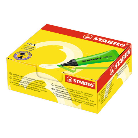 Evidenziatore Stabilo Neon con inchiostro superbrillante. Resiste 4 ore senza cappuccio. Fusto morbido al tatto. Punta a scalpello. Colori assortiti. Confezione da 10 pezzi.