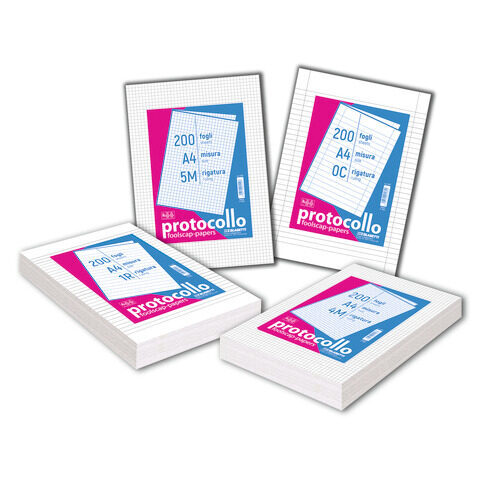 Fogli protocollo rigatura 4F, 4 mm con margine, in carta non filigranata da 60 g/m². Disponibili in risma da 200 fogli. Formato A4. Questi articoli sono prodotti con energia solare.
