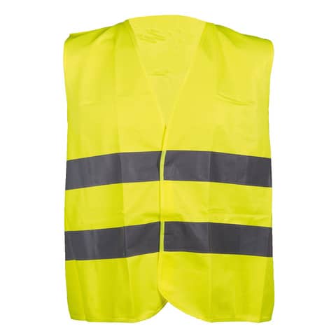 Gilet fluorescente con scollo a V in maglia di poliestere. Apertura centrale con nastro a strappo. Due bande retroriflettenti che circondano la vita di altezza 6 cm. Grammatura 125 gr/mq.