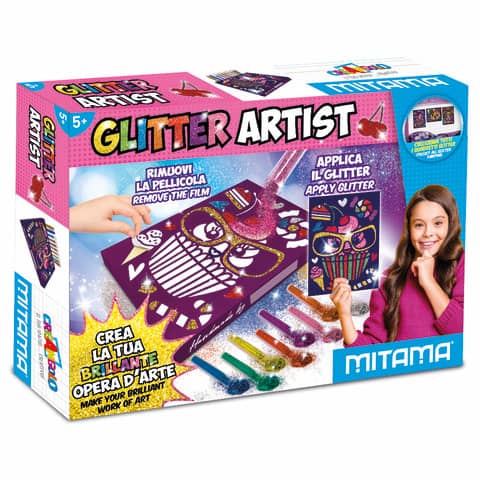 Glitter Artist – la scatola di colorazione creativa della linea CreAngolo, per realizzare fantastici quadretti super colorati e glitterati da poter appendere. La confezione – composta da 1 quadretto formato 30x23x3 cm, 8 tubi glitter e 2 colle glitter.