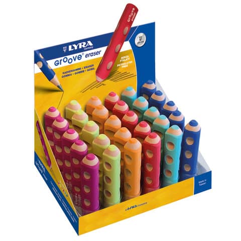 Lyra eraser aggiunge simpatia all?ergonomia! La gommina senza ftalati completa la gamma di pastelli colorati Lyra Groove, gi? nota per le sue caratteristiche, e propone con la stessa tecnologia una nuova gommina a forma di matita nei colori invitanti da collezionare.
