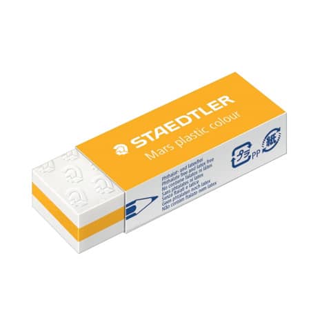 Gomma Staedtler Mars? Plastic Colour. Qualità premium per alte prestazioni. Residui minimi. Pratico involucro di cellofan con apertura a strappo. Fascetta scorrevole per un uso funzionale. Senza ftalati e latice. Si mantiene perfettamente nel tempo. Cancellature impeccabili con poco consumo. Non scolorisce la carta. Gomma con design a sandwich (bianco-colore-bianco) con fascetta scorrevole che si adatta al colore interno della gomma.