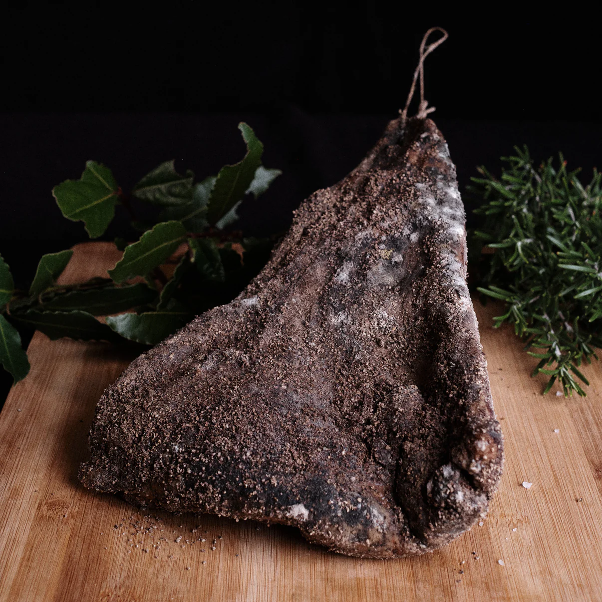 Viene salato per circa una settimana, aromatizzato con sale, pepe e aglio e poi sottoposto a una stagionatura di due mesi.
