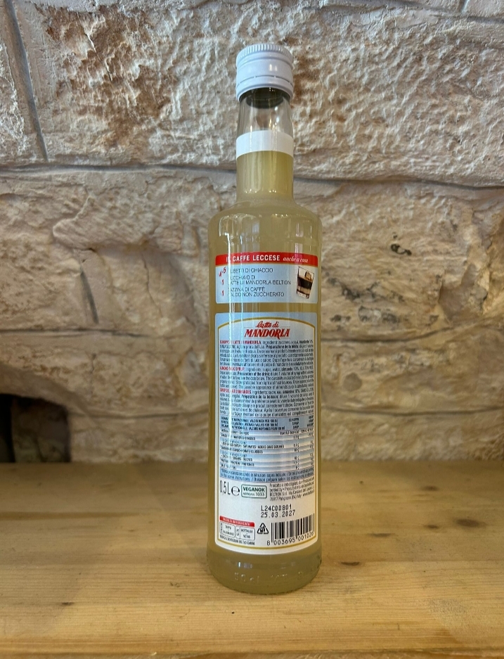 Il *Latte di Mandorla è un delizioso sciroppo dolce a base di estratto di mandorle, perfetto per rinfrescarsi nelle calde giornate estive o per preparare il tipico *caffè leccese*. Si tratta di un prodotto *senza glutine* e *senza aromi artificiali*, adatto anche a chi segue un’alimentazione vegetariana o vegana (certificato VeganOK).