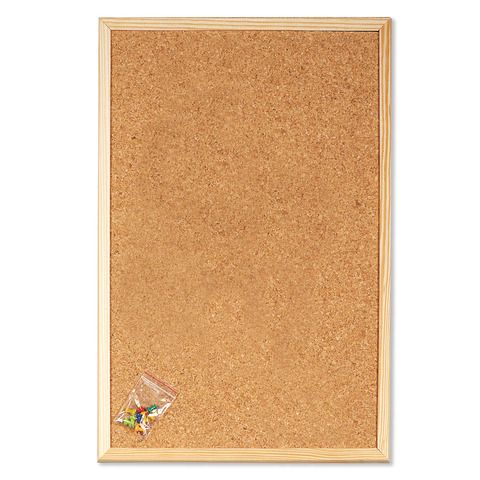 Lavagna in sughero con cornice in legno naturale. Completa di spilli. Formato 40×60 cm.