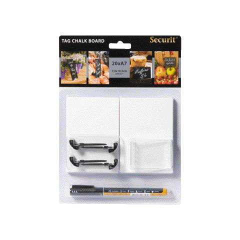 Set da 20 Lavagne Tag Nere formato A7 con 1 pennarello bianco + 4 supporti con punta + 2 supporti trasparenti compresi. Dimensioni 10,5×7,4×0,1cm, peso 0,2 kg. Lavagne Tag realizzate con precisione su una superficie di scrittura doppia, flessibili, antigraffio e facili da pulire. Resistenti ai raggi UV e agli agenti atmosferici. Utilizzabili in appoggio oppure infilzate grazie all’apposita base a chiodo.