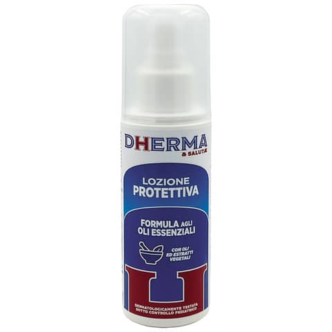 Dherma & Salutae Lozione corpo protettiva con formula agli oli essenziali. Prodotto naturale senza sostanze insetticide, adatto anche ai bambini e testato sotto controllo pediatrico. La sua formulazione specifica con oli ed estratti vegetali sfrutta le proprietà degli oli essenziali. Spray no-gas 75 ml. Lozione indicata per la protezione della pelle e la prevenzione delle punture di insetto.
