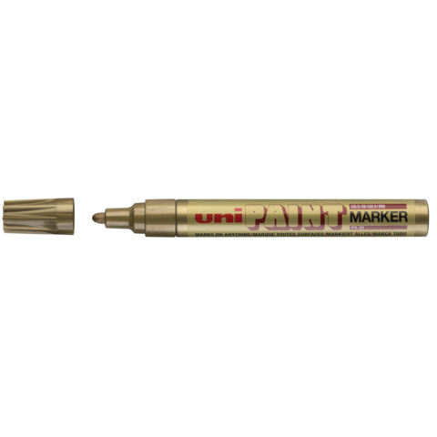 Marcatore permanente con inchiostro pigmentato a base d’olio, resistente alla luce, all’acqua e al calore fino a 250?. Non contiene zolfo, cloro e silicio. Per scrivere, riparare, ritoccare e decorare in modo indelebile tutte le superfici, come metallo, plastica, legno, vetro, tessuti senza che i colori perdano la loro brillantezza. Ideale per uso industriale e professionale, – utilizzato anche per decorare oggetti in ambito scolastico e domestico. Fusto in alluminio. Tratto medio. Punta in materiale sintetico 2,8 mm. Colore inchiostro: oro.