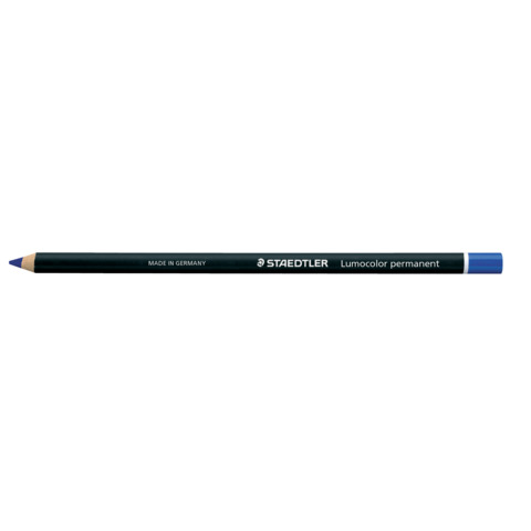 Matita permanent resistente all?acqua e adatta a quasi tutte le superfici quali: vetro, cuoio, stoffa, pietra, metallo, legno, plastica. I colori sono intensi e resistenti alla luce con pigmenti non corrosivi. Il tratto – coprente sulle superfici chiare, scure e trasparenti. Non si secca e non penetra la carta. Colore: blu.