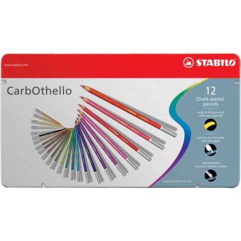 Scatola in metallo composta da 12 matite colorate CarbOthello. Pu? essere usato a secco o miscelato. Parzialmente acquerellabile: i contorni rimangono precisi e chiari. Spessore del tratto 4,4 mm.