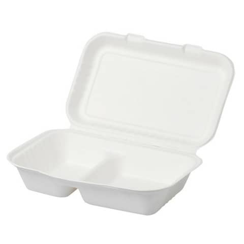 Men? Box realizzato in polpa di cellulosa e suddiviso in 2 scomparti. Colore bianco. Dimensioni: 230 x 65 x 150 mm. Peso netto unitario: 31 grammi. Ideale per riporre e trasportare fino a 2 differenti pietanze. Adatti al contatto con alimenti: fino a una temperatura massima di 90 °C per 30 minuti, in microonde fino a 800 Watt per 2 minuti. Non utilizzabile in forno n? in congelatore. Confezione composta da 50 pezzi.