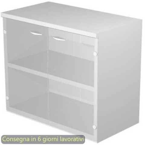 Mobile basso della linea Presto, una linea operativa contemporanea progettata per un utilizzo quotidiano ed intensivo in grado di soddisfare tutte le esigenze funzionali ed estetiche. La gamma completa degli elementi permette di allestire ogni ambiente di lavoro, personalizzandolo con stile. Scrivanie con dimensioni conformi alle normative sulla sicurezza dei posti di lavoro in ufficio. Dimensioni L. 80 x P. 35 x H. 72 cm. Top sp. 22 mm. Struttura, ante e ripiani sp. 18 mm. Un ripiano regolabile in altezza con un sistema di bloccaggio nella posizione desiderata. Ante in vetro satinato senza serratura. Il mobile, rifinito posteriormente nello stesso colore della struttura, pu? essere utilizzato come parete divisoria. Dotato di piedini regolabili in altezza per un perfetto livellamento sul pavimento. Imballi in cartone riciclato alto spessore a tutela dell?ambiente. Produzione certificata conforme alle procedure UNI EN ISO 9001. Certificazioni FSC e PEFC. Struttura grigia.