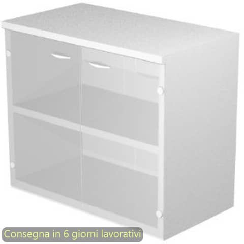 Mobile basso della linea Presto, una linea operativa contemporanea progettata per un utilizzo quotidiano ed intensivo in grado di soddisfare tutte le esigenze funzionali ed estetiche. La gamma completa degli elementi permette di allestire ogni ambiente di lavoro, personalizzandolo con stile. Scrivanie con dimensioni conformi alle normative sulla sicurezza dei posti di lavoro in ufficio. Dimensioni L. 80 x P. 44 x H. 72 cm. Top sp. 22 mm. Struttura, ante e ripiani sp. 18 mm. Un ripiano regolabile in altezza con un sistema di bloccaggio nella posizione desiderata. Ante in vetro satinato senza serratura. Il mobile, rifinito posteriormente nello stesso colore della struttura, pu? essere utilizzato come parete divisoria. Dotato di piedini regolabili in altezza per un perfetto livellamento sul pavimento. Imballi in cartone riciclato alto spessore a tutela dell?ambiente. Produzione certificata conforme alle procedure UNI EN ISO 9001. Certificazioni FSC e PEFC. Struttura bianca.