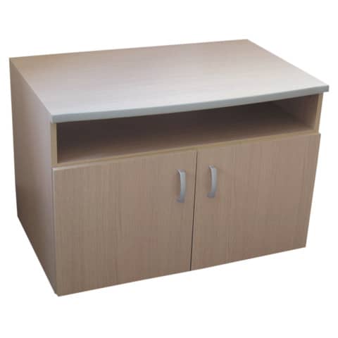 Piano in nobilitato melaminico di spessore 25 mm, profilato in PVC alluminio, rappresenta una soluzione estetica originale ed allo stesso tempo rassicurante, e si integra alla perfezione in qualsiasi ambiente lavorativo anche preesistente. Fianchi e ante spessore 18 mm. Con 1 ripiano superiore alle ante.