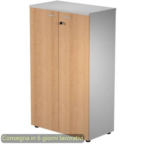 Mobile medio della linea Presto, una linea operativa contemporanea progettata per un utilizzo quotidiano ed intensivo in grado di soddisfare tutte le esigenze funzionali ed estetiche. La gamma completa degli elementi permette di allestire ogni ambiente di lavoro, personalizzandolo con stile. Scrivanie con dimensioni conformi alle normative sulla sicurezza dei posti di lavoro in ufficio. Dimensioni L. 80 x P. 44 x H. 120 cm. Top sp. 22 mm. Struttura, ante e ripiani sp. 18 mm. Due ripiani regolabili in altezza con un sistema di bloccaggio nella posizione desiderata. Ante in melaminico con una pratica serratura. Il mobile, rifinito posteriormente nello stesso colore della struttura, pu? essere utilizzato come parete divisoria. Dotato di piedini regolabili in altezza per un perfetto livellamento sul pavimento. Imballi in cartone riciclato alto spessore a tutela dell?ambiente. Produzione certificata conforme alle procedure UNI EN ISO 9001. Certificazioni FSC e PEFC. Struttura color grigio alluminio, ante di colore faggio.