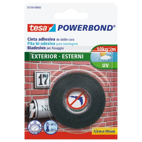 tesa Powerbond? ESTERNI – un nastro di fissaggio con tenuta extra forte studiato appositamente per l’uso su superfici solide all’esterno. – resistente agli agenti atmosferici, ai raggi UV, all?acqua e alle temperature estreme. – ideale per fissare oggetti come numeri civici al muro, in modo permanente e con facilit?. Una singola striscia di 10 cm pu? sorreggere fino a 1 kg. tesa Powerbond? ESTERNI funziona su qualsiasi superficie liscia come piastrelle, mattoni, pietra, metallo e sulla maggior parte delle materie plastiche.