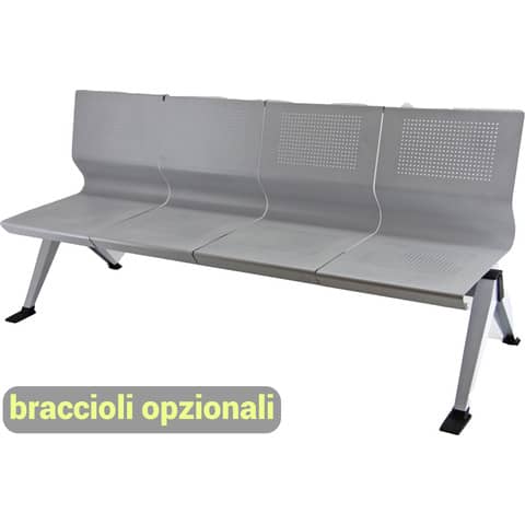 Panca a 5 posti collettivit?-attesa Panair PA5P, struttura in acciaio verniciato grigio, con finitura alluminio, a 4 gambe, schienale fisso, braccioli opzionali. Seduta e schienale forati traspiranti, l?ideale per ambienti d?attesa.