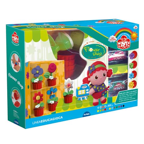 Prendersi cura dei colori del mondo, modellando bellissimi fiori in pasta con i vasetti stampanti e far crescere piantine da esporre nel negozio. Un pack ricco di contenuto, con vetrinetta e bancone 3D, vasetti stampanti, elementi da schiccare, un vero annaffiatoio e ben 600 g di pasta per giocare. Contenuto: 12 salsicciotti da 50 g; 4 vasetti stampanti; 1 mattarello, 1 coltellino, 1 forbicina; 1 annaffiatoio; 1 scatola gioco porta oggetti con soggetti da ritagliare; 1 foglietto con oggetti pre-fustellati.