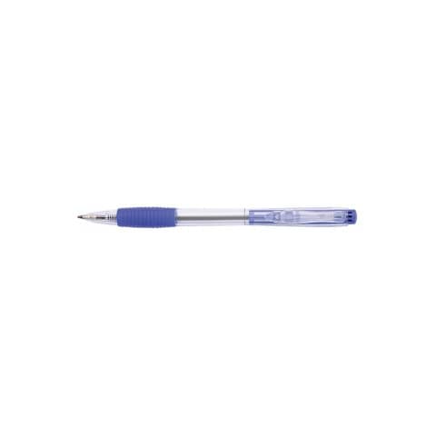Penna a sfera a scatto. Punta 0,7 mm, retrattile con ricarica. Involucro appositamente progettato ed ergonomico. Impugnatura in gomma per una scrittura confortevole. Involucro trasparente per controllare il grado di consumo di inchiostro. Inchiostro impermeabile. Tratto 0,5 mm. Colore blu.