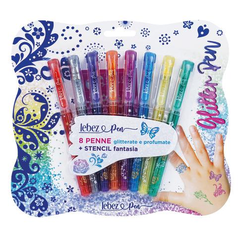 Glitter gel pen con inchiostro glitterato profumato in 6 colori assortiti. Disponibili anche stencil decorativi utili per realizzare colorati lavoretti. Dimensioni blister: b.19 x h.20 cm.