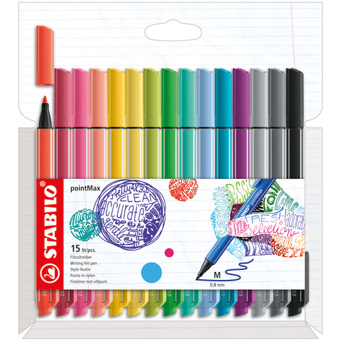 Pennarelli Stabilo PointMax Fineliner Premium con punta nylon ”L” da 0.8 mm. Resiste fino a 24 ore senza cappuccio. Inchiostro inodore a base d’acqua. Dotato di comoda clip. Astuccio appendibile con 15 colori: 488/5 – giallo chiaro, 488/7 – corallo, 488/11 – blu ghiaccio, 488/13 – verde ghiaccio, 488/14 – lime, 488/26 – albicocca, 488/29 -rosa chiaro, 488/31 – azzurro chiaro, 488/43 – verde foglia, 488/44 – giallo, 488/46 – nero, 488/49 – rosso fragola, 488/58 – lilla, 488/94 – grigio freddo chiaro, 488/96 – grigio scuro.
