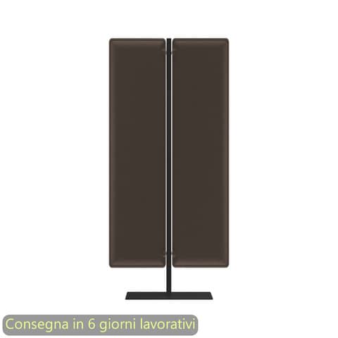 Piantana/divisorio mobile con pannelli fonoassorbenti antracite, struttura nero opaco. Linea Woody. Base 60×30 cm. N?2 pannelli 160×40 cm. Dimensioni: L.83,8xH.180 cm. Imballo in cartone riciclato a tutela dell’ambiente. Produzione certificata conforme procedure UNI EN ISO 9001. Pannelli divisori acustici fonoassorbenti certificati. Progettati per aumentare il benessere nell?ambiente di lavoro e per definire aree nelle quali conciliare operativit? e privacy. I pannelli sono realizzati in fibra di poliestere termoformata e si compongono di più strati accoppiati di densit? variabile con tessuto esterno Mirage. La densit? variabile ottenuta attraverso la termoformatura del materiale consente l?assorbimento di un più ampio spettro di lunghezze d?onda, contrariamente a quanto accade con schermi divisori tradizionali. Per creare un buon ambiente acustico – infatti fondamentale garantire tre caratteristiche: assorbimento, diffusione e attenuazione. Moody, con le sue proprietà , incide su questi tre fronti, riuscendo a garantire un ambiente sonoro equilibrato. Gli angoli arrotondati dei pannelli ne addolciscono le forme ed eliminano gli spigoli pericolosi in caso di urto accidentale. I pannelli sono un prodotto ecologico perché ottenuti da materiale riciclato e a sua volta riciclabile.