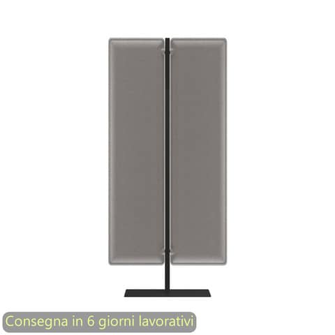 Piantana/divisorio mobile con pannelli fonoassorbenti grigi, struttura nero opaco. Linea Woody. Base 60×30 cm. N?2 pannelli 140×40 cm. Dimensioni: L.83,8xH.160 cm. Imballo in cartone riciclato a tutela dell’ambiente. Produzione certificata conforme procedure UNI EN ISO 9001. Pannelli divisori acustici fonoassorbenti certificati. Progettati per aumentare il benessere nell?ambiente di lavoro e per definire aree nelle quali conciliare operativit? e privacy. I pannelli sono realizzati in fibra di poliestere termoformata e si compongono di più strati accoppiati di densit? variabile con tessuto esterno Mirage. La densit? variabile ottenuta attraverso la termoformatura del materiale consente l?assorbimento di un più ampio spettro di lunghezze d?onda, contrariamente a quanto accade con schermi divisori tradizionali. Per creare un buon ambiente acustico – infatti fondamentale garantire tre caratteristiche: assorbimento, diffusione e attenuazione. Moody, con le sue proprietà , incide su questi tre fronti, riuscendo a garantire un ambiente sonoro equilibrato. Gli angoli arrotondati dei pannelli ne addolciscono le forme ed eliminano gli spigoli pericolosi in caso di urto accidentale. I pannelli sono un prodotto ecologico perché ottenuti da materiale riciclato e a sua volta riciclabile.