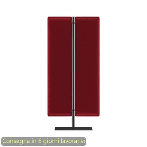 Piantana/divisorio mobile con pannelli fonoassorbenti rossi, struttura nero opaco. Linea Woody. Base 60×30 cm. N?2 pannelli 120×40 cm. Dimensioni: L.83,8xH.140 cm. Imballo in cartone riciclato a tutela dell’ambiente. Produzione certificata conforme procedure UNI EN ISO 9001. Pannelli divisori acustici fonoassorbenti certificati. Progettati per aumentare il benessere nell?ambiente di lavoro e per definire aree nelle quali conciliare operativit? e privacy. I pannelli sono realizzati in fibra di poliestere termoformata e si compongono di più strati accoppiati di densit? variabile con tessuto esterno Mirage. La densit? variabile ottenuta attraverso la termoformatura del materiale consente l?assorbimento di un più ampio spettro di lunghezze d?onda, contrariamente a quanto accade con schermi divisori tradizionali. Per creare un buon ambiente acustico – infatti fondamentale garantire tre caratteristiche: assorbimento, diffusione e attenuazione. Moody, con le sue proprietà , incide su questi tre fronti, riuscendo a garantire un ambiente sonoro equilibrato. Gli angoli arrotondati dei pannelli ne addolciscono le forme ed eliminano gli spigoli pericolosi in caso di urto accidentale. I pannelli sono un prodotto ecologico perché ottenuti da materiale riciclato e a sua volta riciclabile.
