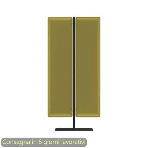 Piantana/divisorio mobile con pannelli fonoassorbenti verde acido, struttura nero opaco. Linea Woody. Base 60×30 cm. N?2 pannelli 160×40 cm. Dimensioni: L.83,8xH.180 cm. Imballo in cartone riciclato a tutela dell’ambiente. Produzione certificata conforme procedure UNI EN ISO 9001. Pannelli divisori acustici fonoassorbenti certificati. Progettati per aumentare il benessere nell?ambiente di lavoro e per definire aree nelle quali conciliare operativit? e privacy. I pannelli sono realizzati in fibra di poliestere termoformata e si compongono di più strati accoppiati di densit? variabile con tessuto esterno Mirage. La densit? variabile ottenuta attraverso la termoformatura del materiale consente l?assorbimento di un più ampio spettro di lunghezze d?onda, contrariamente a quanto accade con schermi divisori tradizionali. Per creare un buon ambiente acustico – infatti fondamentale garantire tre caratteristiche: assorbimento, diffusione e attenuazione. Moody, con le sue proprietà , incide su questi tre fronti, riuscendo a garantire un ambiente sonoro equilibrato. Gli angoli arrotondati dei pannelli ne addolciscono le forme ed eliminano gli spigoli pericolosi in caso di urto accidentale. I pannelli sono un prodotto ecologico perché ottenuti da materiale riciclato e a sua volta riciclabile.