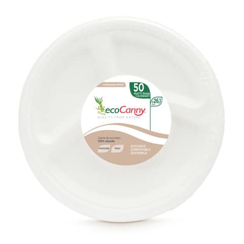 Piatti a 3 scomparti linea Everyday in conf. da 50 pz. Misure ?261x 28 mm. Prodotto ecologico derivante da fibre vegetali estratte dalla canna da zucchero; 100% biodegradabile e compostabile, smaltibile nell’organico. Idoneo al contatto con gli alimenti come da regolamento (CE) 1935/2004 e D.P.R. 777/1982. Alta resistenza al peso, ai liquidi, ai cibi grassi e salati. Utilizzabile in microonde per max 6 minuti a 800 W. Utilizzabile in forno per max 30 minuti a 120 °C. Utilizzabile in freezer a -18°C e in frigo. Confezione riciclabile nella plastica. Etichetta smaltibile nella carta.
