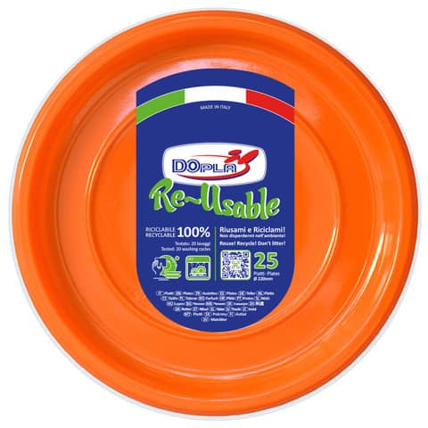 Piatti piani arancioni in polistirene h.19 mm conf. 25 pz Dopla Reusable – 220 mm – 11825