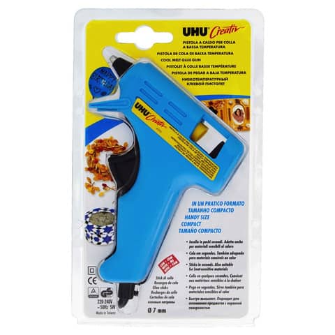Pistola manuale per colla a caldo a basse temperature di UHU per hobby, bricolage, artigianato e riparazioni. La ridotta temperatura di fusione, permette di incollare polistirolo espanso e altri materiali sensibili al calore. Raggiunge la temperatura di esercizio in 5 minuti. La pistola – affidabile e sicura, il supporto retrattile garantisce la stabilit? e il beccuccio isolato dal calore la rendono adatta anche all’utilizzo da parte dei bambini sotto controllo di un adulto. Incolla polistirene (polistirolo), tessuti, sagex, legno, gomma, plastiche, ceramica, vetro, pietra, metallo, pelle, sughero, cartone, espanso e molti altri. Con questa pistola – assolutamente necessario usare solo gli stick di termo colla UHU, diametro 7mm.