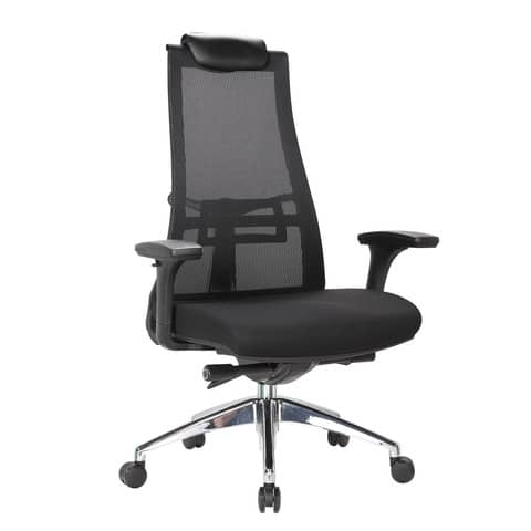 Poltrona direzionale con braccioli Milwaukee rivestita in tessuto di colore nero e schienale in rete tecnica traspirante. Con poggiatesta in PU imbottito e supporto lombare. Braccioli morbidi in PU orientabili e regolabili in altezza e in profondità . Schienale regolabile in 4 posizioni. Seduta ampia e sagomata in schiuma ad alta densit?. Meccanismo Syncro. Sistema di elevazione a gas per la regolazione del sedile in altezza. Manopola per la regolazione di tensione. Razze in alluminio con ruote piroettanti in poliuterano. Struttura in polipropilene.