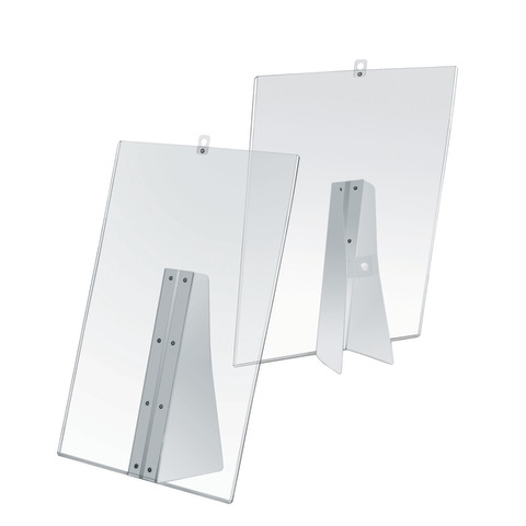 Porta avvisi da banco e da parete in pvc flessibile antiurto. Formato: A4. Il prodotto – composto da pratiche alette a scomparsa per essere esposto su tavolo e da un gancio che permette l’esposizione a parete.