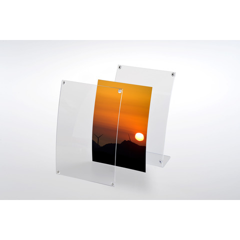 Porta avvisi/fotografie formato A4 magnetico da tavolo, curvo, per uso verticale. Realizzato in materiale acrilico trasparente. Questa cornice, con la sua linea semplice e pulita, garantisce una perfetta visibilità del contenuto e particolari in evidenza.