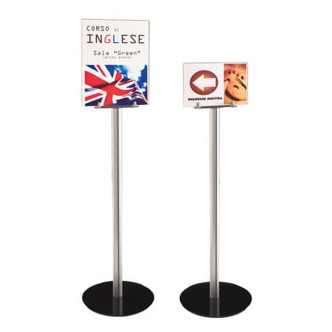 Porta segnaletica da pavimento su piantana, della serie Menu Board. Porta avvisi in acrilico formato A4 per posizionamento sia in verticale che in orizzontale. Struttura in alluminio e base in acciaio. ?: 32 cm. Dimensioni: 126×21 cm. Peso netto: 6 Kg. Peso lordo: 7 Kg.