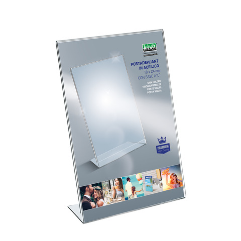 Portadepliant verticale in acrilico trasparente con base a ”L”. Formato 18×24 cm. Colore trasparente.