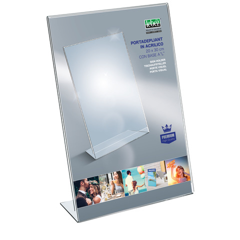 Portadepliant in acrilico con base a L Lebez formato 20×30 cm – verticale – trasparente – 7057