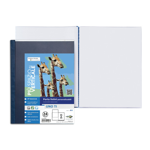 Portalistini ad interni fissi in polipropilene a buccia, con copertina personalizzabile. Formato a libro 25×35 cm e 24 interni. Colore blu.