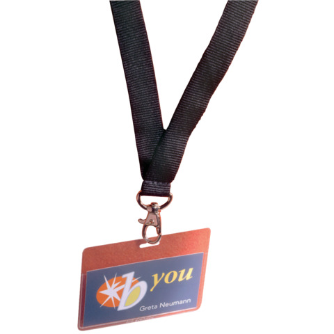 con cordoncino in tessuto nero da 20mm x 44cm dotato di clip di sicurezza antisoffocamento e moschettone in metallo. Una volta agganciato evita la fuoriuscita accidentale dell'inserto. Fornito con inserto in cartoncino personalizzabile |