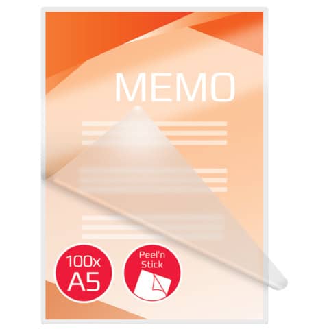 Le pouch Peel n ‘Stick sono ideali per creare insegne istantanee, professionali e accattivanti. Il retro adesivo aderisce alla maggior parte dei materiali incluso vetro, metallo e cartone. Basta staccare la carta di supporto per scoprire lo strato autoadesivo. 125 micron. Finitura lucida. Formao A5. Confezione da 100.