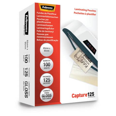 Pouches per plastificatrici Fellowes Standard Capture125 finitura lucida – 2×125 ?m 65×95 mm Conf. 100 pz – 5306702