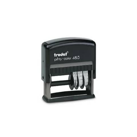 Timbro datario con testo autoinchiostrante personalizzato TRODAT PRINTY 4813 – 26 x 9 mm – Altezza caratteri data: 3,8 mm – max 2 righe. Personalizzazione dell?impronta disponibile nei colori NERO, BLU, VERDE, ROSSO. Leggero e compatto. Validit? datario 12 anni. Massima qualità delle impronte. Inchiostro indelebile in conformit? alla norma DIN ISO 14145-2. Modello cartuccia di ricambio Trodat 6/4817. Sostituzione della cartuccia semplice e pulita.