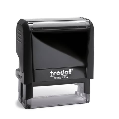Timbro di testo autoinchiostrante personalizzato TRODAT PRINTY 4914 ECO – 64 x 26 mm – max 7 righe. Personalizzazione dell?impronta disponibile nei colori NERO, BLU, VERDE, ROSSO. Leggero e compatto. Massima qualità delle impronte. Inchiostro indelebile in conformit? alla norma DIN ISO 14145-2. Modello cartuccia di ricambio Trodat 6/4914. Sostituzione della cartuccia più semplice e pulita. Posizionamento preciso grazie alla base trasparente. Prodotto in materiale riciclato post consumo.