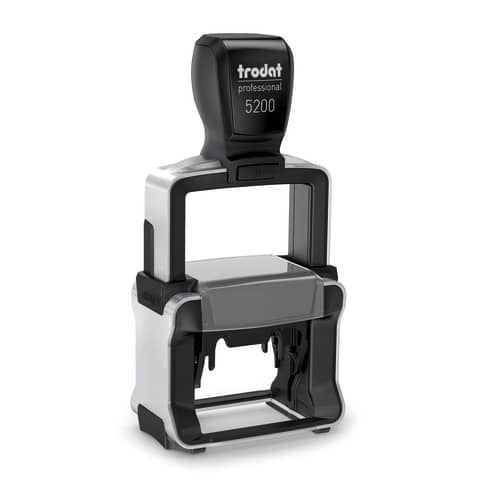 Timbro personalizzato TRODAT PROFESSIONAL 5200 4.0 – 41 x 24 mm – max 6 righe. Personalizzazione dell?impronta disponibile nei colori NERO, BLU, VERDE, ROSSO. Solida struttura in acciaio inossidabile. Impugnatura ergonomica per uso professionale. Massima qualità delle impronte. Inchiostro indelebile in conformit? alla norma DIN ISO 14145-2. Modello cartuccia di ricambio Trodat 6/50. Sostituzione della cartuccia più semplice e pulita. Semplice posizionamento dell’impronta. Prodotto eco sostenibile.