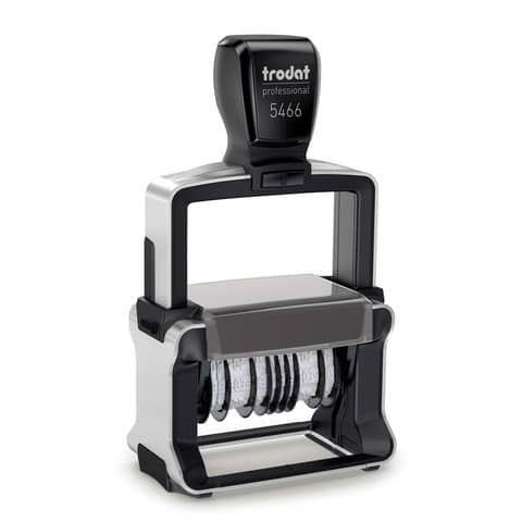 Timbro doppio datario personalizzato TRODAT PROFESSIONAL 5466 4.0/PL – doppia data – 56 x 33 mm – altezza caratteri data: 4 mm – fino a 3+3 righe. Personalizzazione dell?impronta disponibile nei colori NERO, BLU, VERDE, ROSSO. Solida struttura in acciaio INOX. Impugnatura ergonomica per uso professionale. Massima qualità delle impronte. Inchiostro indelebile in conformit? alla norma DIN ISO 14145-2. Modello cartuccia di ricambio Trodat 6/56. Sostituzione della cartuccia più semplice e pulita. Regolazione pulita della data grazie alla copertura delle bande. Validit? datario 12 anni. Semplice posizionamento dell’impronta. Prodotto eco sostenibile.
