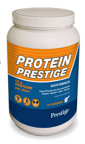 PROTEIN PRESTIGE è un integratore alimentare a base di proteina concentrata del siero del latte con vitamine e minerali, quali Calcio e Vitamina D per il mantenimento della normale funzione muscolare e di ossa normali. Contiene Zinco che contribuisce alla normale funzione del sistema immunitario. Apporta Vitamine del gruppo B e Magnesio che contribuisce alla riduzione della stanchezza e dell’affaticamento. Arricchito con Colina e Taurina. Le proteine contribuiscono alla crescita e al mantenimento della massa muscolare.