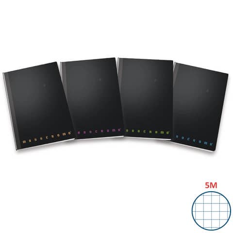 Maxi Filo Singer formato 22×28 cm – Fogli 60+2, carta interna da 80 gr, cover nera in PPL con scritta ”Monocromo” in 4 colori fluo assortiti (arancione, blu, rosa, verde). Rilegatura filo singer. Prodotto certificato FSC. Rigatura 5M.