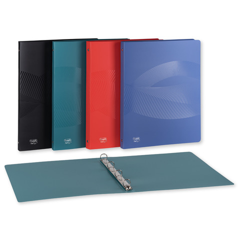 Raccoglitori realizzati in polipropilene opaco riciclato post consumo. Elegante trama geometrica brillante sulla superficie del prodotto. Certificazione Blue Angel a garanzia della salvaguardia dell?ambiente. Formato interno: 22 x 30 cm. Dotati di meccanismo a 4 anelli tondi, di diametro 15 mm e 30 mm. Disponibili in 4 colori assortiti: azzurro, rosso, verde e nero. Formato esterno: 26 x 32 cm. Formato interno: 22 x 30 cm. Confezione da 20 pezzi.